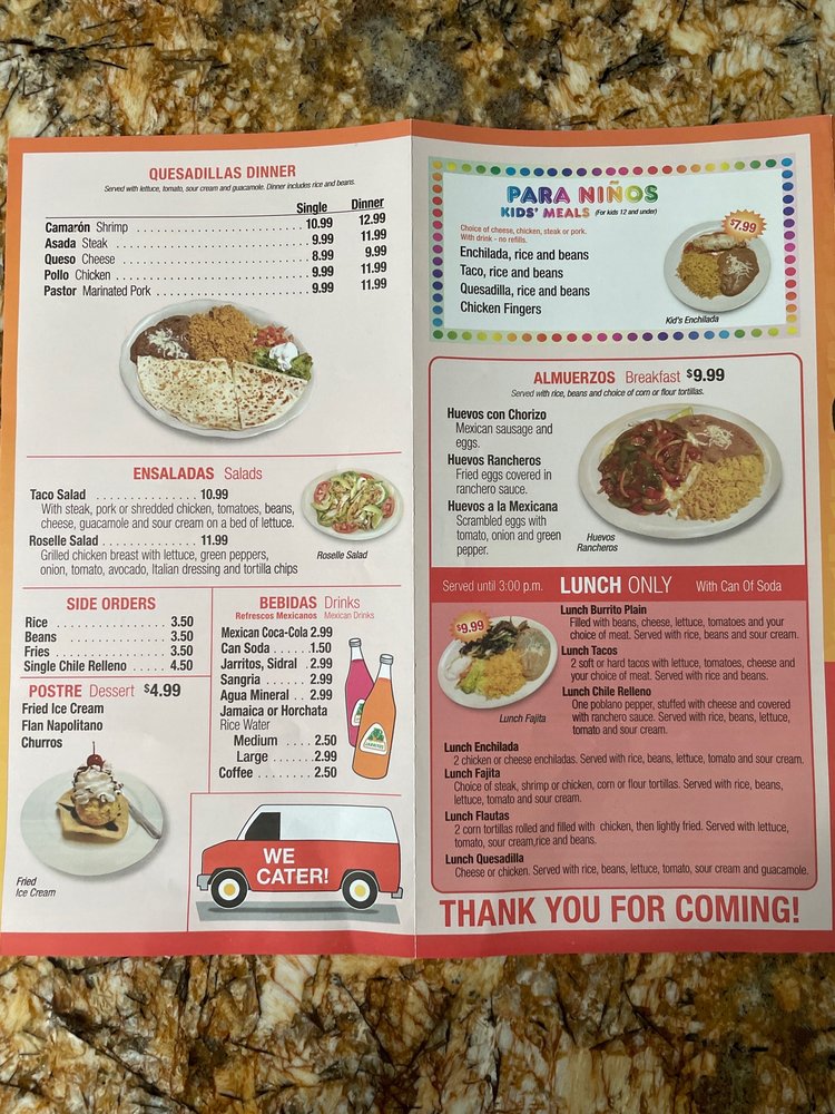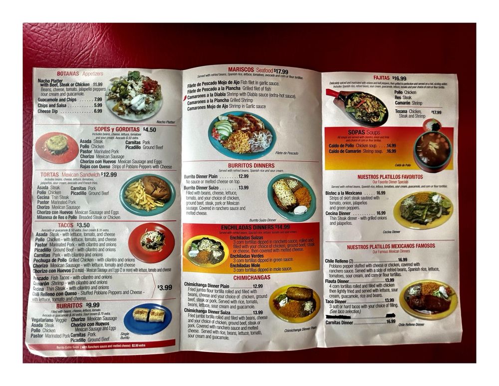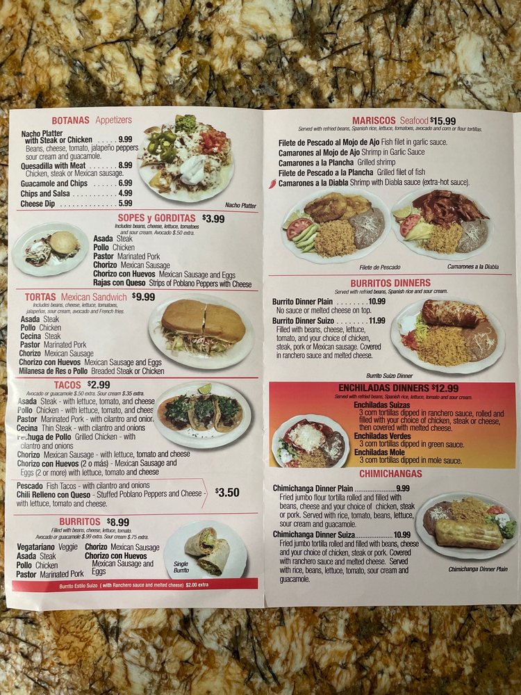Poblano pepper stuffed with cheese or chicken, covered with ranchero sauce. Served with a side of refried beans, Spanish rice, lettuce, tomatoes, sour cream, and corn or flour tortillas.