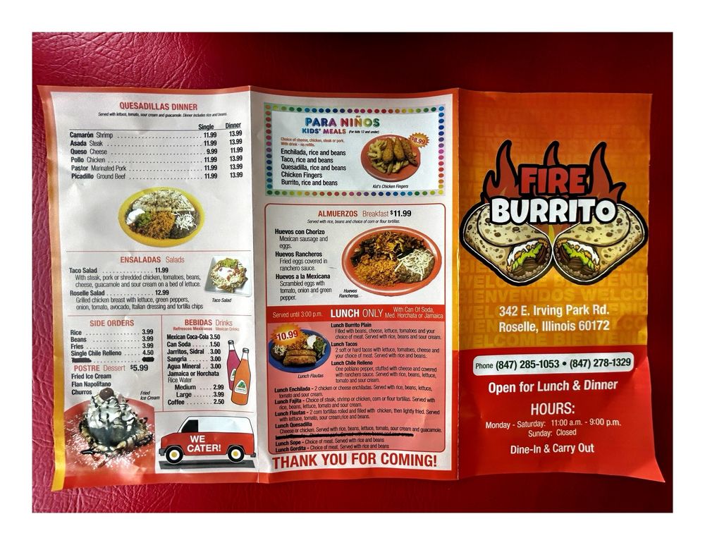 Introducing Fire Burrito, a vibrant new gem in the heart of Roselle, IL, specializing in authentic Mexican cuisine. Located at 342 E Irving Park Rd, this cozy spot boasts a welcoming atmosphere where dogs are allowed, making it perfect for casual dining or takeout. The menu features mouthwatering options, including flavorful tortas like the Asada Torta and the indulgent Chorizo con Huevos Torta, all priced at just $9.99.